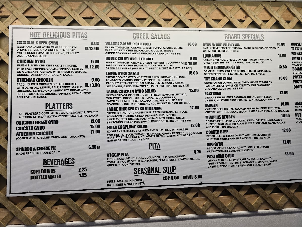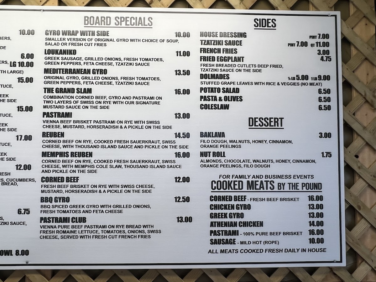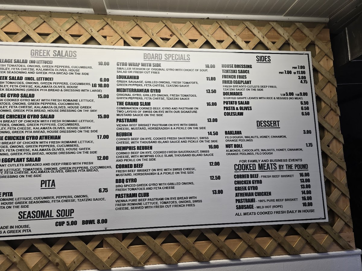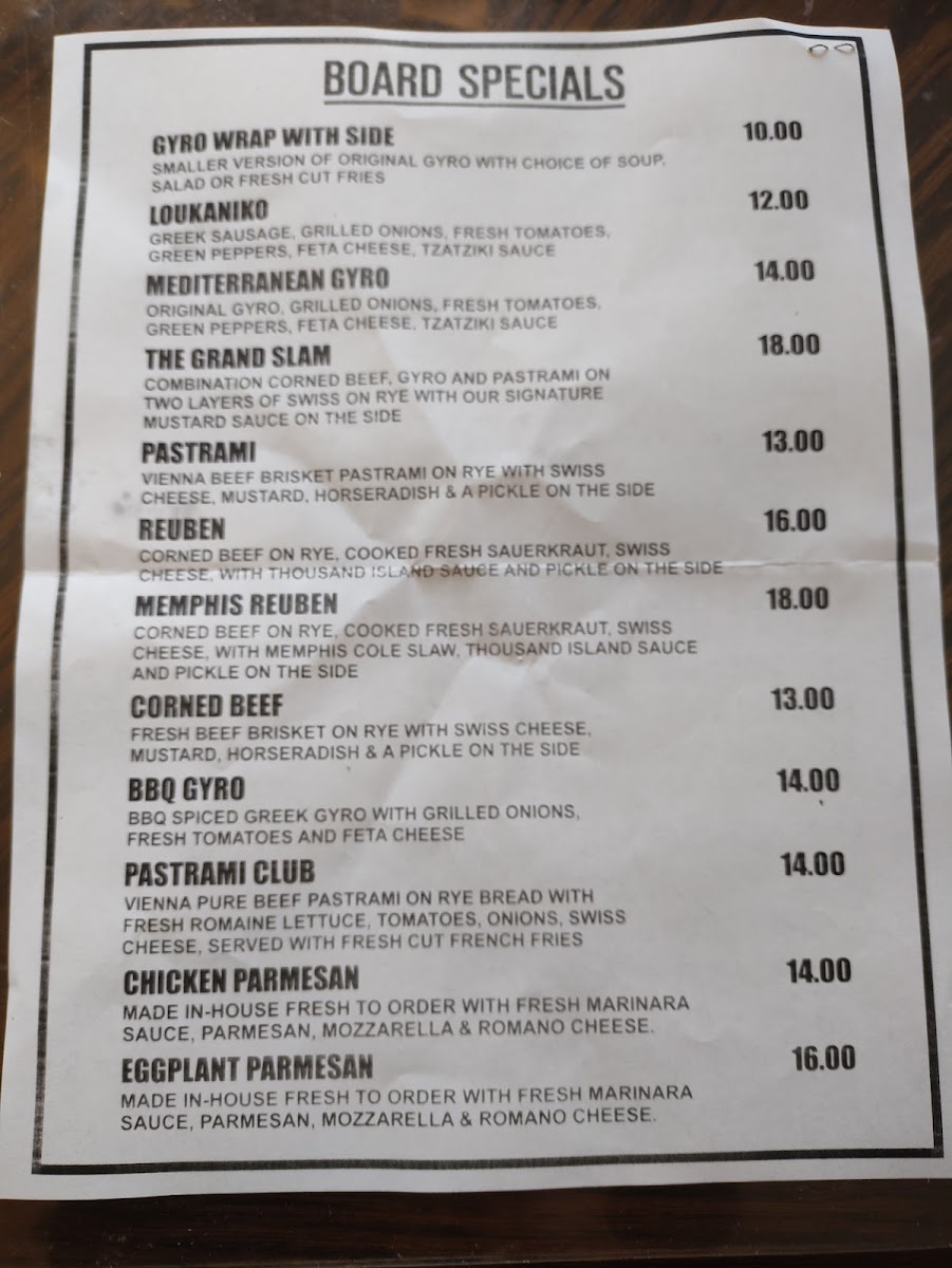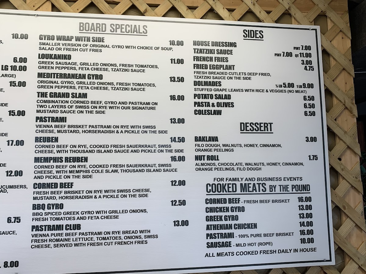 If you're in the mood for a special treat, the Board Specials section has something to tempt every palate. The Gyro Wrap With Side, Loukaniko, and Mediterranean Gyro are standouts, each bringing its own unique twist on traditional Greek flavors. The The Grand Slam and Pastrami offer a more indulgent option, perfect for those looking for something a bit different.