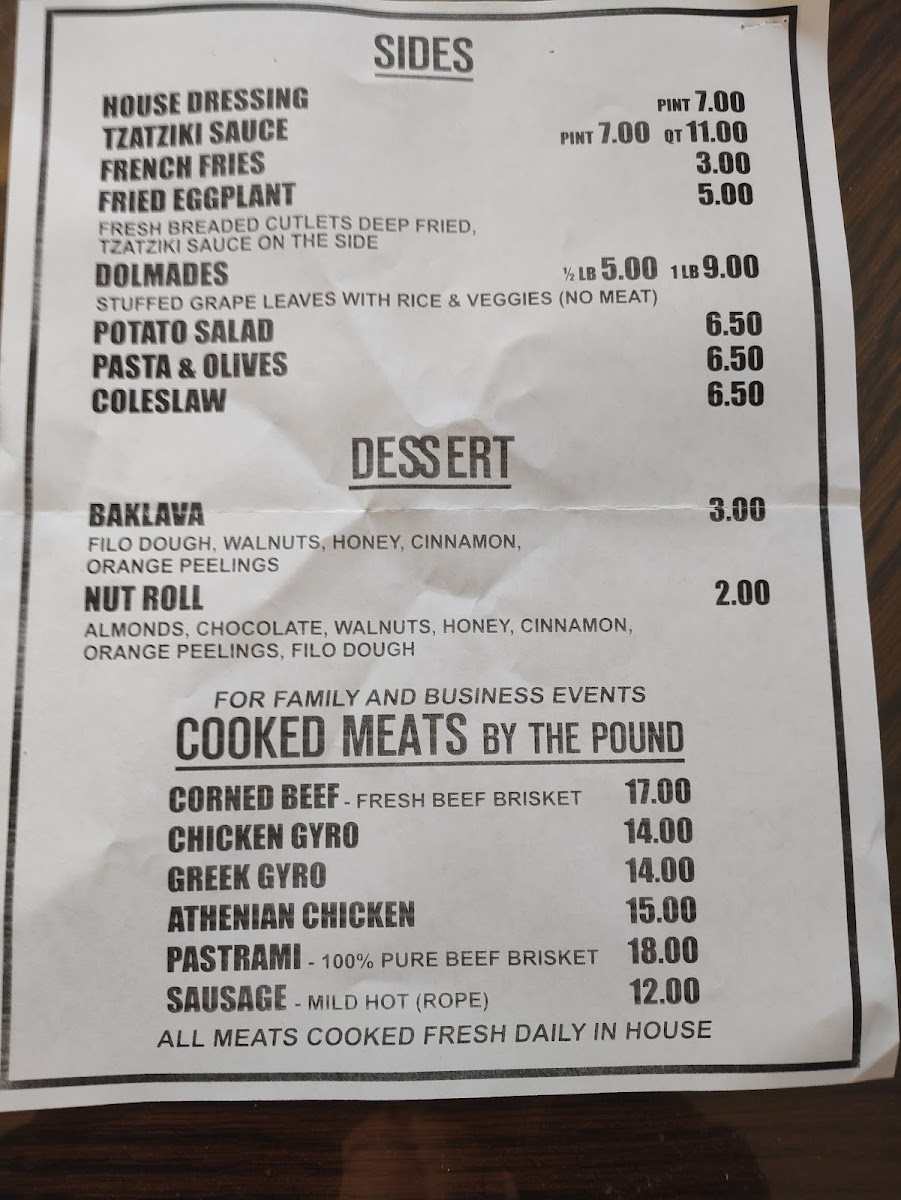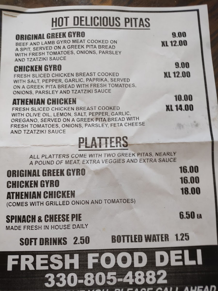 Overall, Fresh Food Deli's menu offers a rich selection of Greek and Mediterranean-inspired dishes, with options for every taste and preference. Whether you're in the mood for a hearty gyro, a fresh salad, or a sweet dessert, there's no shortage of flavorful choices.